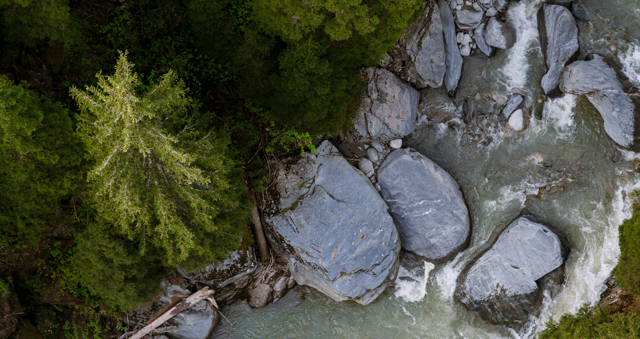 Light gradually conquers the shadows. During our descent to Mörel and then Bitsch on a shaded road, the cold becomes noticeable. We take the opportunity to make a halt and enjoy a life-saving coffee in the sun. The industrial side between Brig and Visp makes us a bit nostalgic for the beautiful landscapes of the previous day. We follow it up with a burger in Turtmann, which will weigh us down for the rest of the day — which became source of much, laughter on that day. Just five minutes from the village, the Turtman waterfall provides us an opportunity to stretch our legs. Our next stop: Pfyn-Finges Nature Park just before Sierre, where we enjoy a small refreshment in a lovely place in the middle of the woods. A detour to Réchy is in order to discover the Rèche waterfall. At the end of the day, we would both like to reach Grône soon as possible, where we will spend the night and relax.